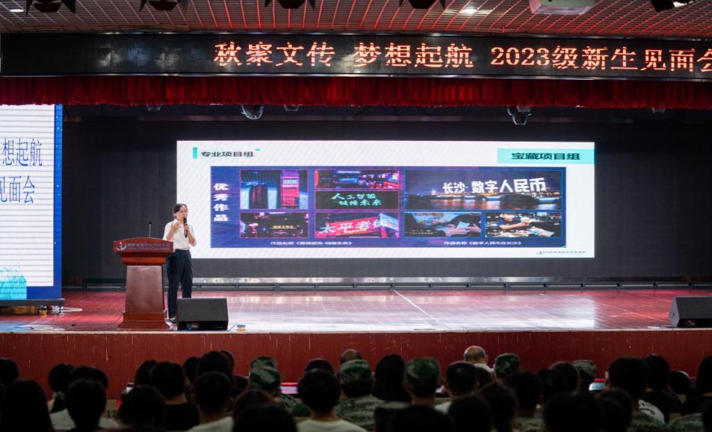 “同学们,欢迎你们加入文化传播与艺术设计学院(以下简称文传院),在当下,我们要树牢理想信念,听党话,跟党走,思想上要求进步。要抓牢主要任务,学理论,重实践,能力上大大提升。要守牢纪法底线,遵法规,守纪律,品德上更加健全。”9月12日,文传院举办2023级新生见面会,学院党总支书记刘达有致欢迎词,并结合个人经验对新生提出了三点要求。“让我们以热烈掌声欢迎学院辅导员团队、教学教辅团队、各专业导师团以及管理干部团队……”文传院的50多名教职工精神矍铄、依次亮相,与新生亲切问候;随后的,各专业介绍与成果展示、创新创业与生涯规划以及专业技能竞赛经验分享把整场新生见面会推向了高潮。