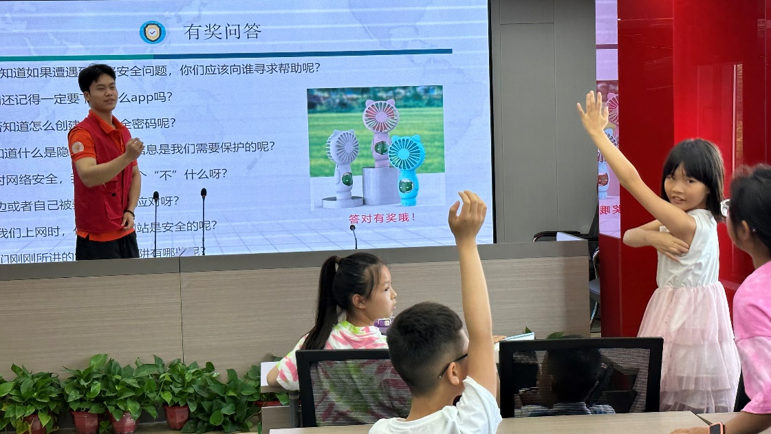 讲解完网络安全知识后,金盾网安公益科教志愿服务队在现场与小朋友们进行网络安全知识的有奖问答,对回答问题正确的小朋友给予奖品奖励。现场的气氛被充分调动的同时,小朋友们也牢牢记住了老师讲解的网络安全知识。