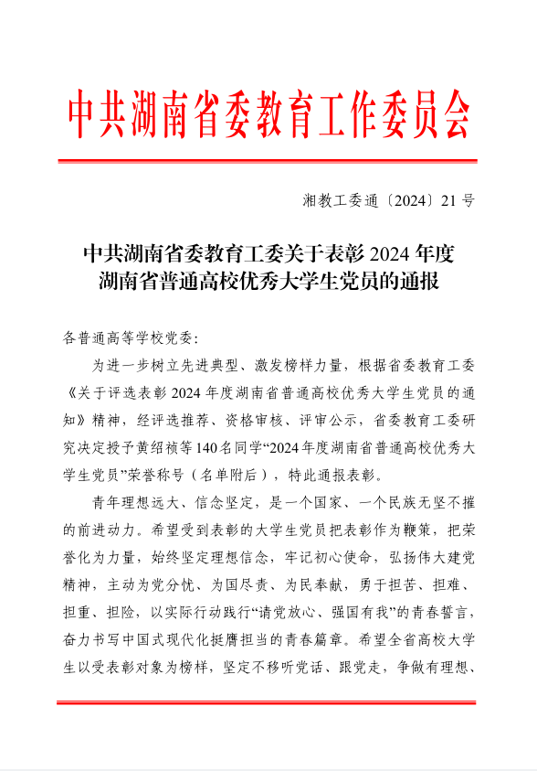 6月27日,beat365计网2103班彭云同志,经过学校评选、推荐,经省教育工委资格审核、评审公示,省教育工委研究决定,授予彭云等140名同学荣获“湖南省优秀大学生党员”荣誉称号。