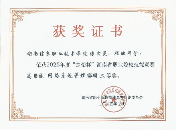 2025年3月19日至21日,湖南省教育厅主办的“楚怡杯”职业技能大赛网络系统管理赛项在长沙民政职业技术学院落幕。湖南信息职院学子在湖南省"楚怡杯"网络系统管理赛项中,由吴烽波、胡云博与陈玄灵、程敏组成的两支队伍,从全省49支劲旅中杀出重围,双双斩获省二等奖。赛事依托企业真实场景,设置网络构建与服务部署双模块,8小时极限考验选手技术应用与实战能力。