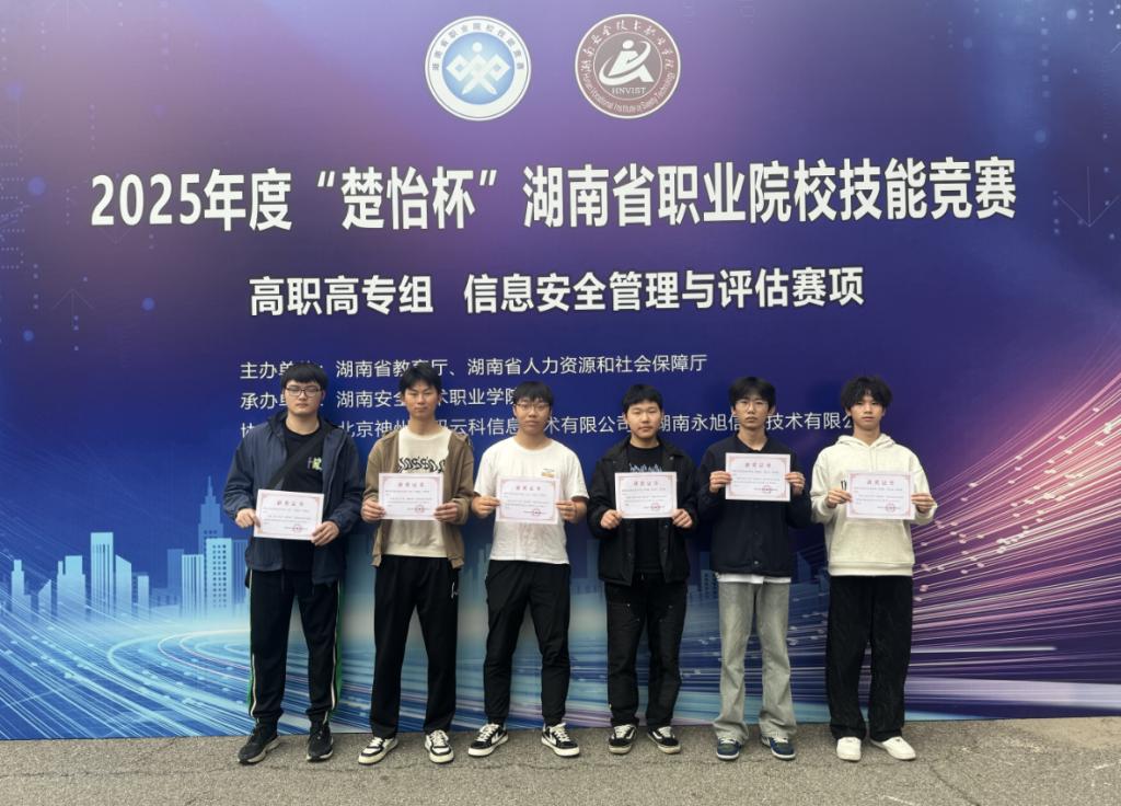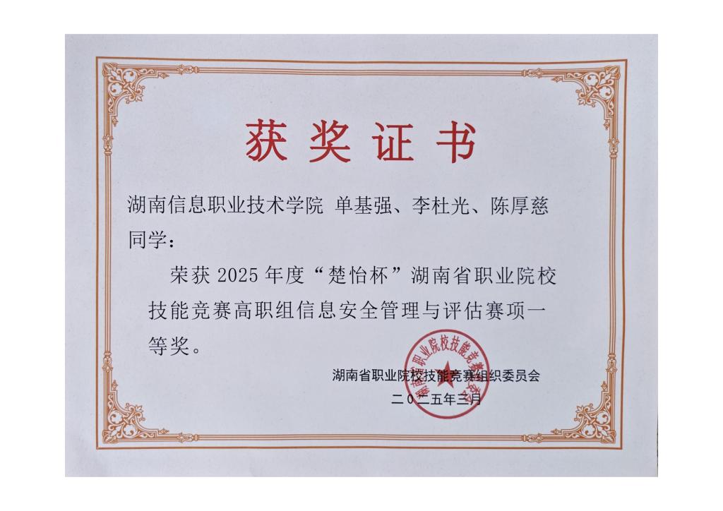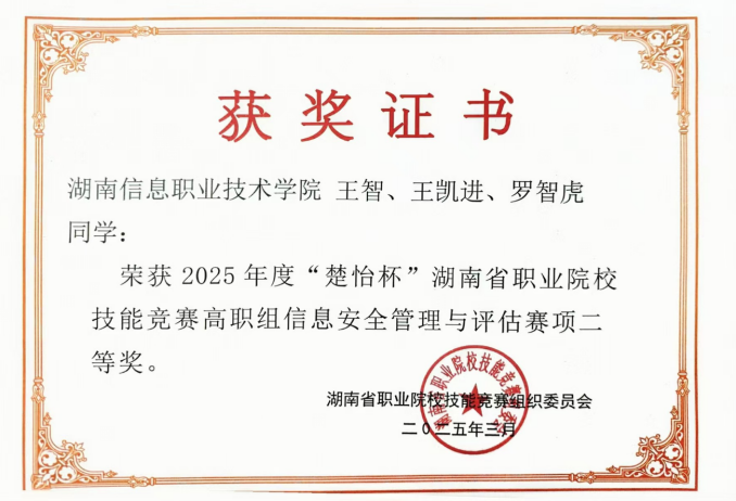 近日,湖南省教育厅主办的“楚怡杯”职业技能大赛信息安全管理与评估赛项在湖南安全职业技术学院落幕。来自湖南省内二十多所学校共56支队伍参与竞赛比拼。经过激烈角逐,beat365英国官方网站学子由李杜光、单基强、陈厚慈组成的团队荣获一等奖第一名,由王凯进、罗智虎、王智组成的团队荣获二等奖。