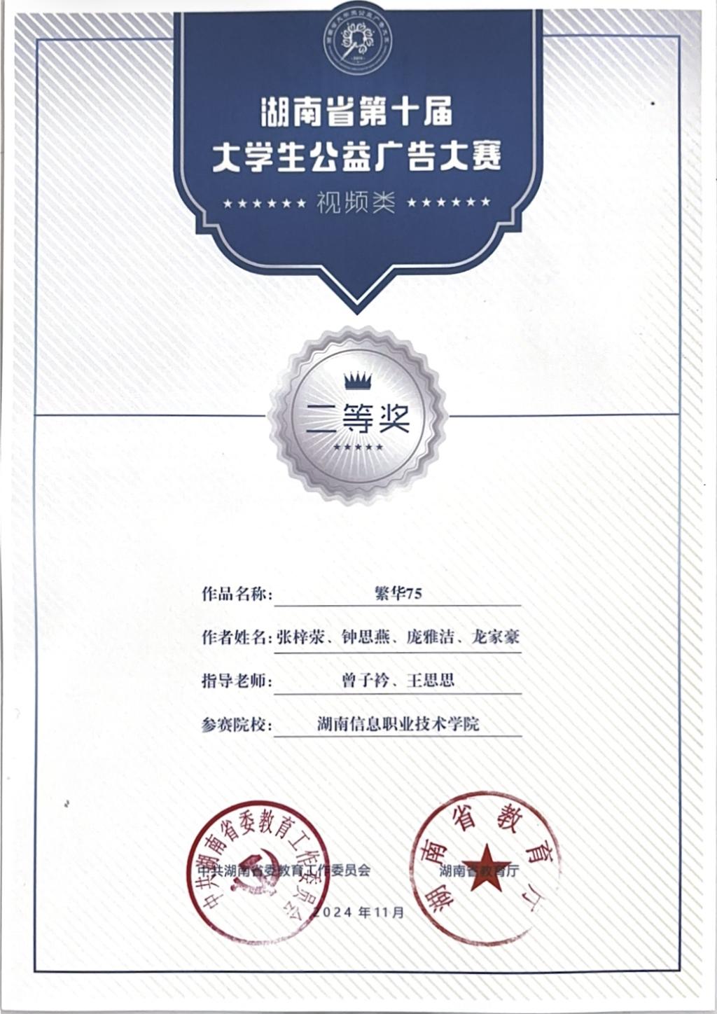 在湖南省第十届大学生公益广告大赛中,beat365学子表现优异,斩获佳绩。由张梓荣、钟思燕、庞雅洁、龙家豪同学创作,曾子衿、王思思老师指导的视频类作品《繁华 75》荣获大赛二等奖。