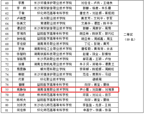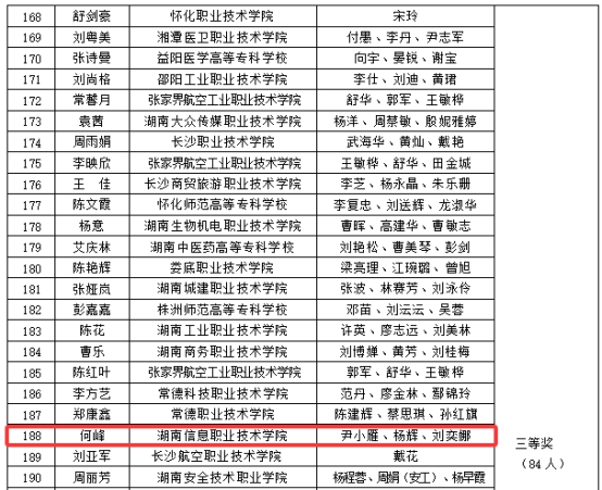 根据《关于开展2025年湖南省高职高专院校“AI+信息素养”大赛的通知》要求,湖南省组织开展了2025年湖南省高职高专院校“AI+信息素养”大赛。大赛分为学生个人赛和教师微课赛,其中学生个人赛共有57所高职高专院校的8万余人参赛,根据大赛规则,共产生一等奖59名、二等奖89名、三等奖84名(名单见附件1);教师微课赛共有40所高职高专院校的101个微课作品参赛,经省内外专家评审,共产生一等奖12名,二等奖18名,三等奖18名(名单见附件2);另外,大赛评出团体优秀组织奖24个(名单见附件3)。现予通报。
