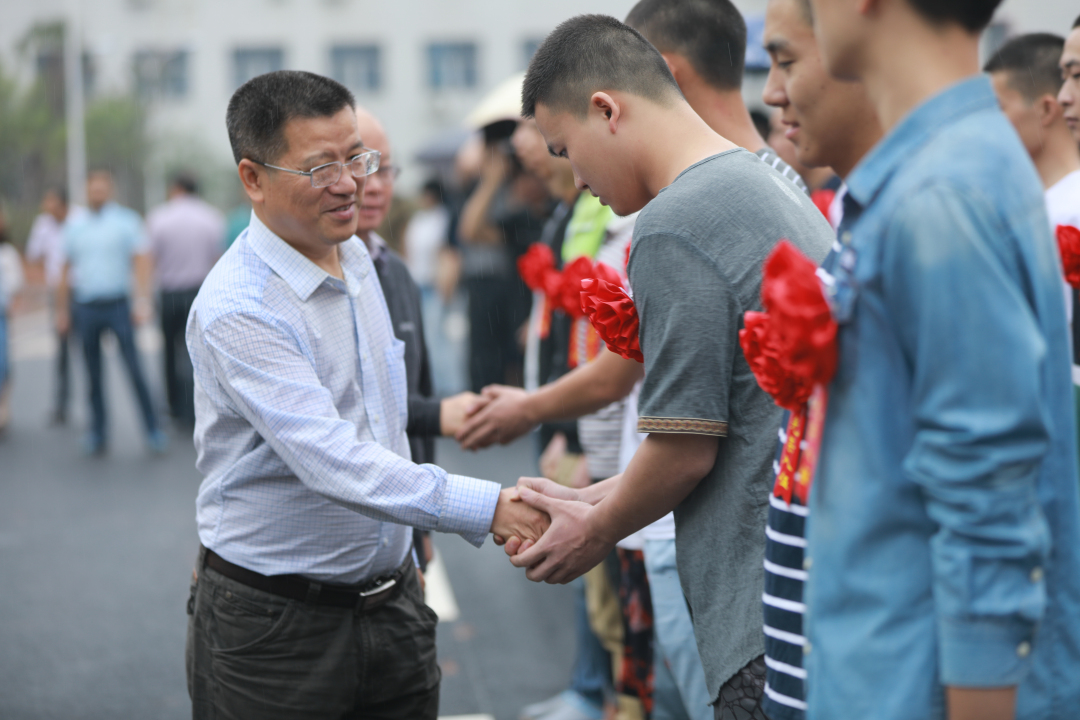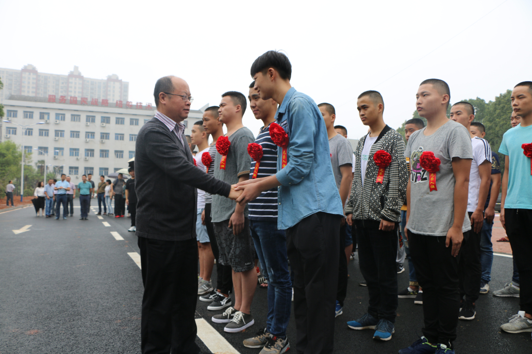会后,党委书记赵兴舟、院长陈剑旄与大学生新兵亲切握手,欢送入伍新兵前往受训基地。