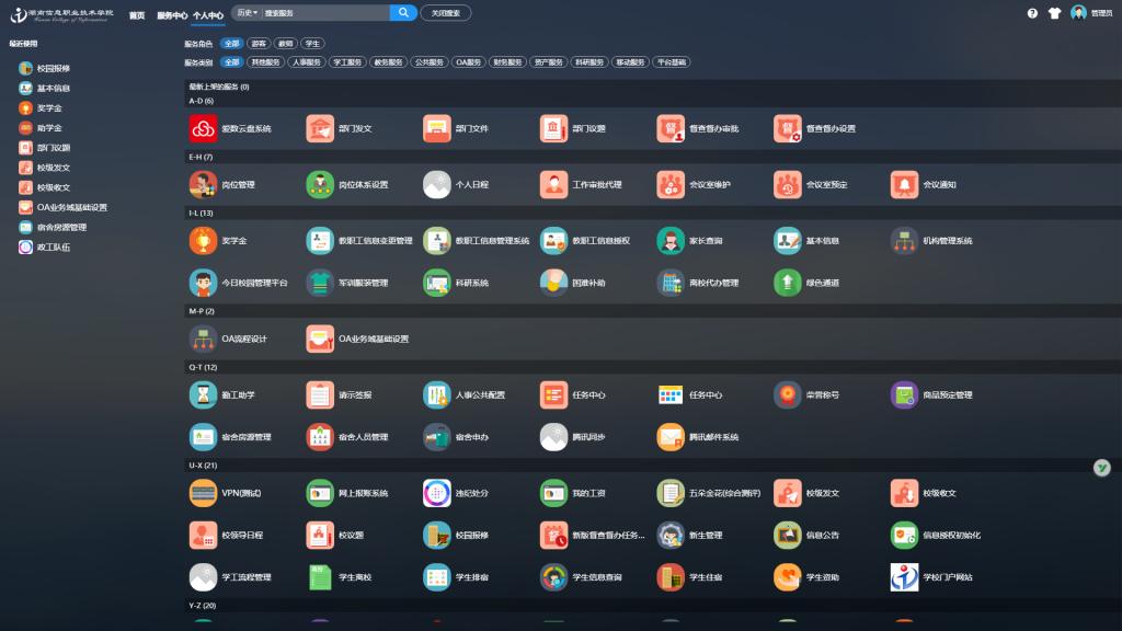 目前校内移动网上办事服务达到95项、PC端一站式服务大厅一期网上办事大厅服务事项达81项。本次移动网上办事服务大厅是基于学院网上办事大厅的数据中心和应用管理平台,推动学院各业务系统迭代升级,加快实现现有校务服务系统整合,建立满足“一网、一门、一次、一张表”要求的“一站式校园微服务流程平台”,逐步实现校务服务事项全流程“网上办”、“掌上办”,真正做到为学院师生办实事,实现“师生少跑腿,数据多跑路”。在此基础上,将学院原来“重”的业务应用系统建设模式,逐渐改变为“轻”的微应用模式,各项服务分门别类集中在事项中心,逐步实现“一事一应用、一事一服务、微应用、微服务、一张表、个性化、大平台”的智慧校园建设目标。