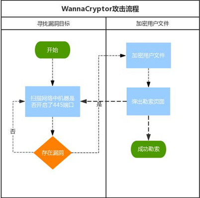 2017年5月份爆发的WannaCry 勒索病毒其实也是蠕虫病毒的一种,只不过这个蠕虫病毒在被感染的计算机上执行的恶意行为不是安装木马、不是删除文件,而是把文件加密并给出勒索提示。WannaCry是第一次大规模爆发的捆绑勒索软件的蠕虫病毒,而且相信不会是最后一次。