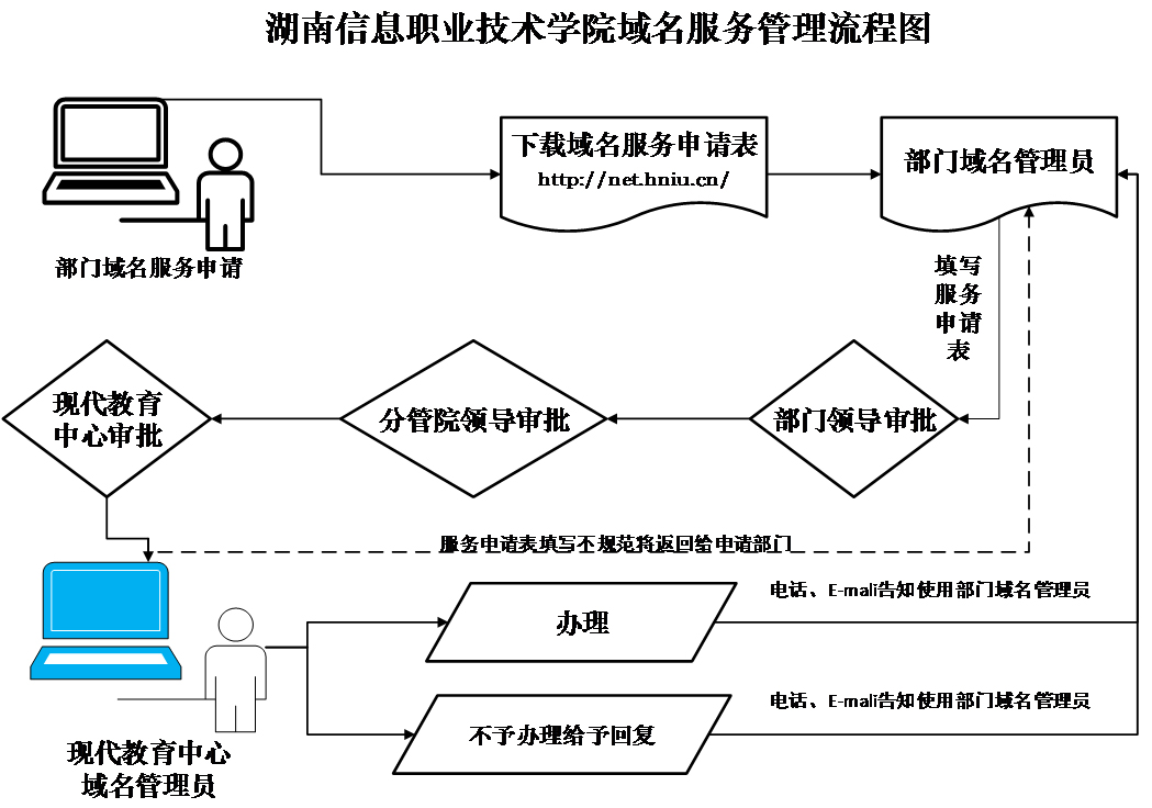 1、 域名申请:从现代教育信息中心下载域名服务申请表→用户填写申请表→用户部门处级分管领导签字,盖公章→将申请表交到现代教育信息中心审批→受理人员检查填写信息、签字、公章是否符合要求,不符合要求则退回更改,域名是否存在可用→将申请信息email给域名管理员并打电话通知→域名管理员添加域名解析→完成后回复受理人员→受理人员通知用户域名申请结果。(如果不能解析给用户简单说明理由)