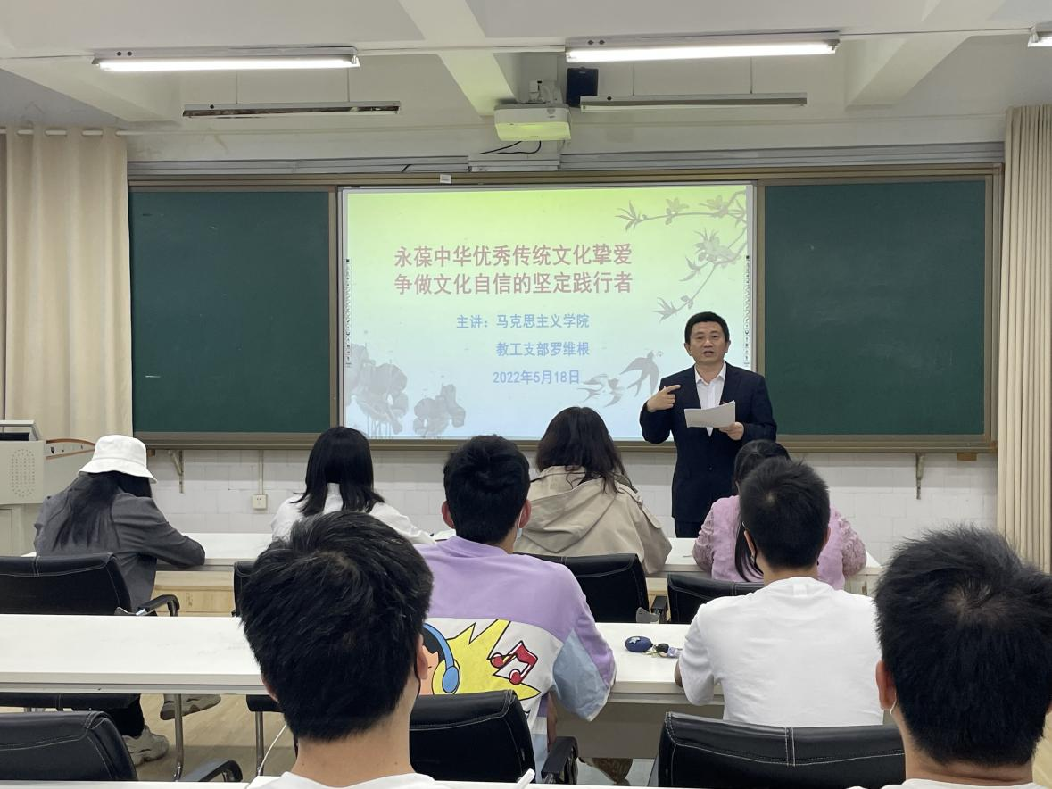 5月18日,马克思主义学院教工支部书记以《永葆中华优秀传统文化挚爱 争做文化自信的坚定践行者》为主题,围绕中华优秀传统文化的科学内涵、时代价值、践行运用三个角度,结合伟大抗疫精神解读中华优秀传统文化的时代价值,引导师生厚植爱国情怀、弘扬奋斗精神、培养创新意识,为机电工程学院学工支部的师生党员和学生入党积极分子上了一堂生动且具有教育意义的党课。