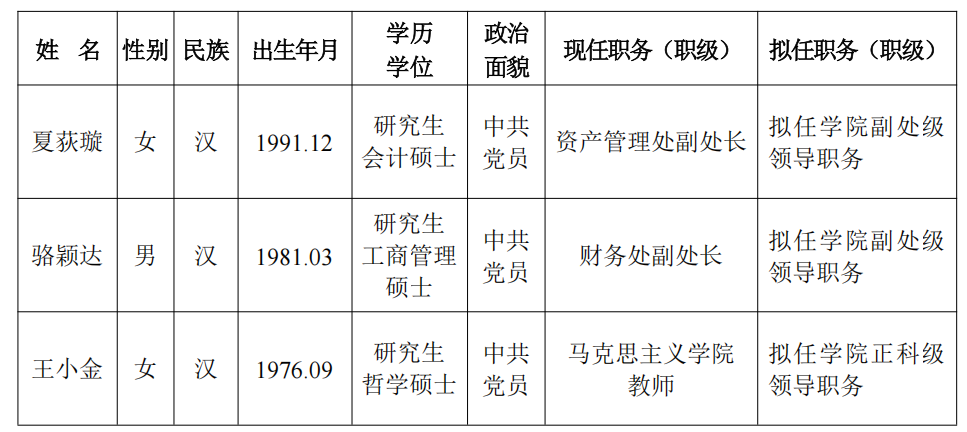 为了加强对干部选拔工作的监督,提高识别和任用干部的准确程度,现对学院党委会研究决定的下列拟任人选进行任前公示: